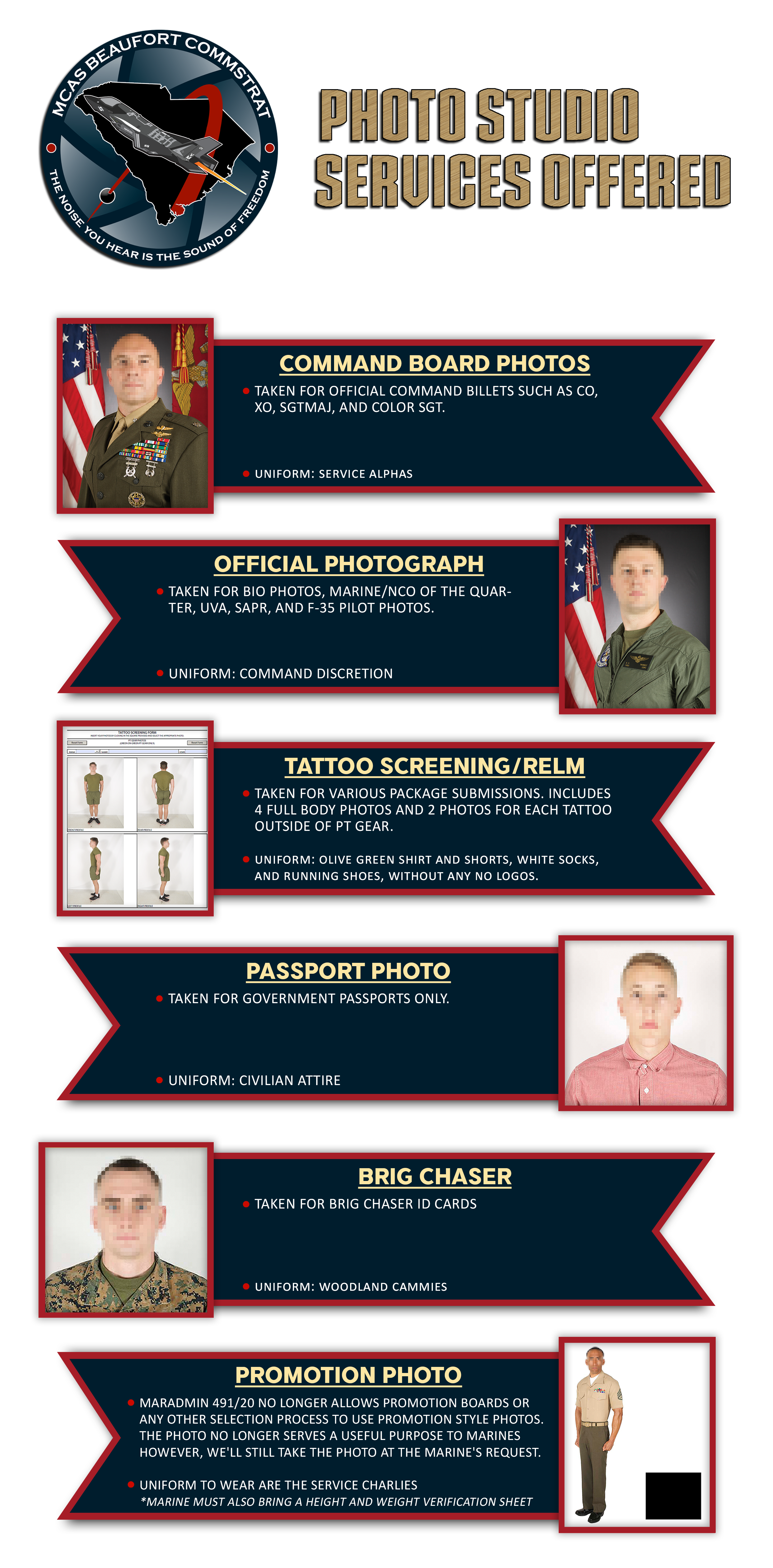 To schedule an appointment with the photo studio, please email BFRT_COMMSTRAT_REQUESTS@usmc.mil